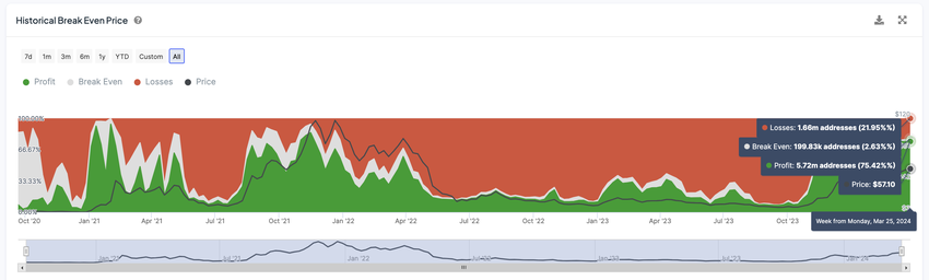 “Historical Break Even Price”, en viktig beregning som viser gjennomsnittsprisen som alle nåværende innehavere ville gått i null, setter søkelyset på investeringens kumulative lønnsomhet. Det er verdt å merke seg at en tidligere klatring til denne lønnsomhetsgrensen på 75 % i 2021 gikk forut for en kraftig økning i AVAX’ kurs fra 75 USD til 117 USD på bare 20 dager.
