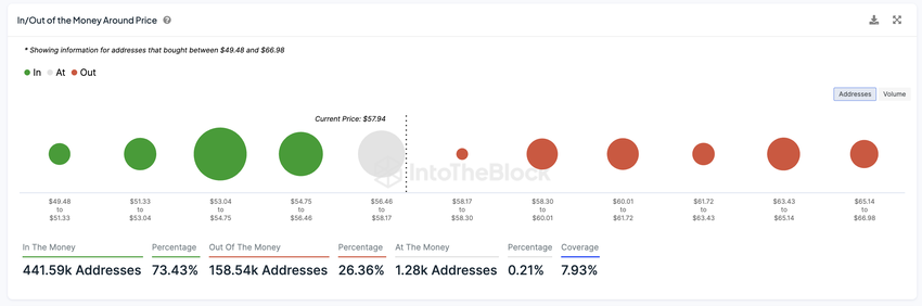 In / Out of the Money Around Price (IOMAP) -diagrammet for Avalanche (AVAX) viser en konsentrasjon av støtte i prisklassen $ 53 til $ 54.75, der innehavere kjøpte det største volumet av AVAX-tokens. Dette gjenspeiles i tilstedeværelsen av betydelige grønne bobler, noe som indikerer at disse eierne er “in the money” og kan fungere som en buffer mot prisfall.