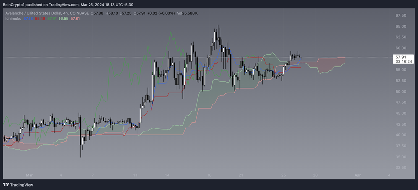Konverteringslinjen, som representerer kortsiktig prismomentum, ligger over baselinjen, en momentumindikator på mellomlang sikt, noe som ytterligere bekrefter det bullish sentimentet for AVAX. Lagging Span ligger imidlertid innenfor kursintervallet fra 26 perioder tilbake, noe som indikerer mangel på sterk momentum, ettersom den ideelt sett burde ligge over kursutviklingen for å gi en sterk bullish bekreftelse.
