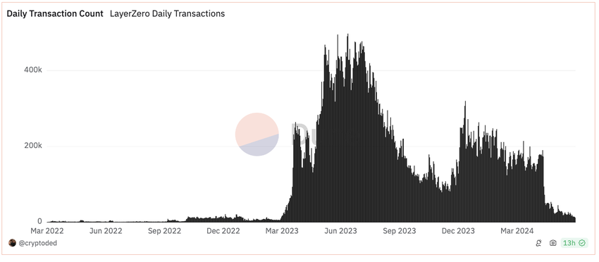 Midt i kontroversen antyder beregninger på kjeden et bearish sentiment i LayerZero-økosystemet. Dune analytics-data viser et fall på over 90% i daglig transaksjonsantall. Denne avskyingen vekk fra toppnivåene kommer når bønder flykter.