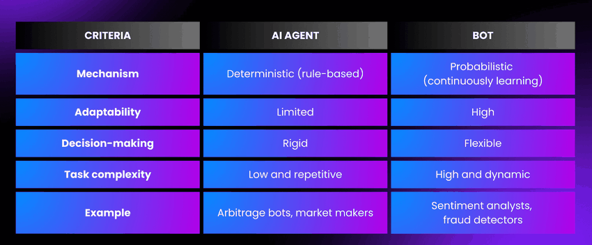 Til slutt utfører de. Enten det er å plassere en handel, flytte midler eller utløse en smart kontrakt, håndterer de handlingen, slik at du ikke trenger å gjøre det. Mens AI-agenter utfører noen av de samme funksjonene som AI-handelsroboter, er førstnevnte mye mer avanserte.