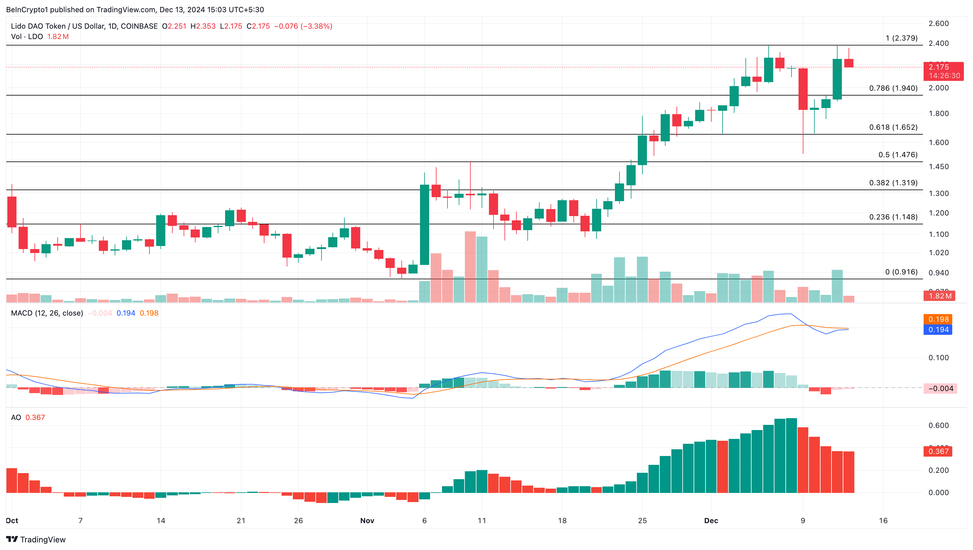 Imidlertid, i dette tilfellet, antyder den negative avlesningen at LDOs pris kan falle til $ 1,65. Denne verdien er der 61,8 % Fibonacci retracement-indikatoren er.