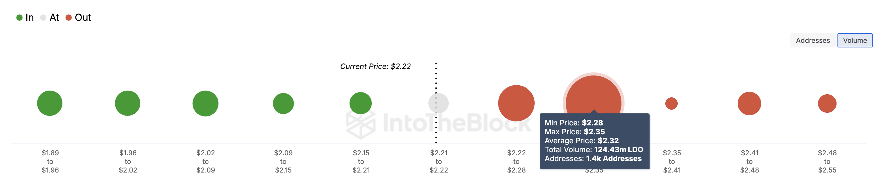 Som vist ovenfor, holder omtrent 1400 adresser 124,43 millioner og akkumulert til en gjennomsnittspris på $ 2,32. Dette volumet er høyere enn de som ble kjøpt mellom $ 1,89 og $ 2,22, noe som indikerer sterk motstand rundt den nåværende verdien. Gitt denne situasjonen, kan LDO oppleve en betydelig tilbakegang.