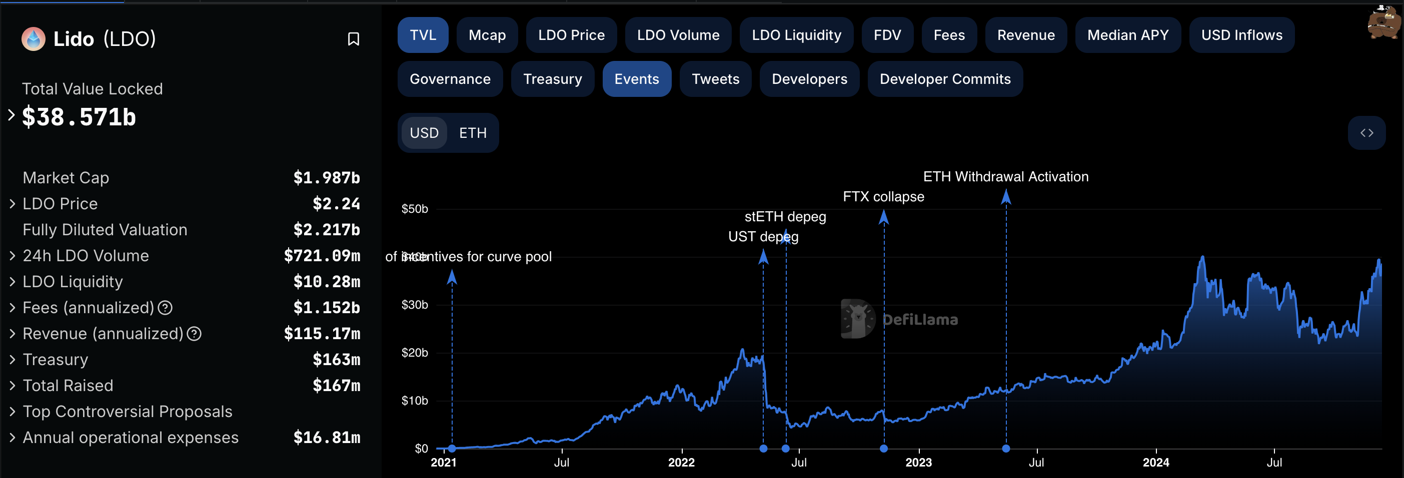 Ifølge DeFiLlama står protokollens Total Value Locked (TVL) for øyeblikket på $ 38,57 milliarder, noe som plasserer den mindre enn $ 2 milliarder unna sin all-time high. Denne veksten antyder fornyet tillit til Lidos evne til å tilby konkurransedyktige avkastninger.