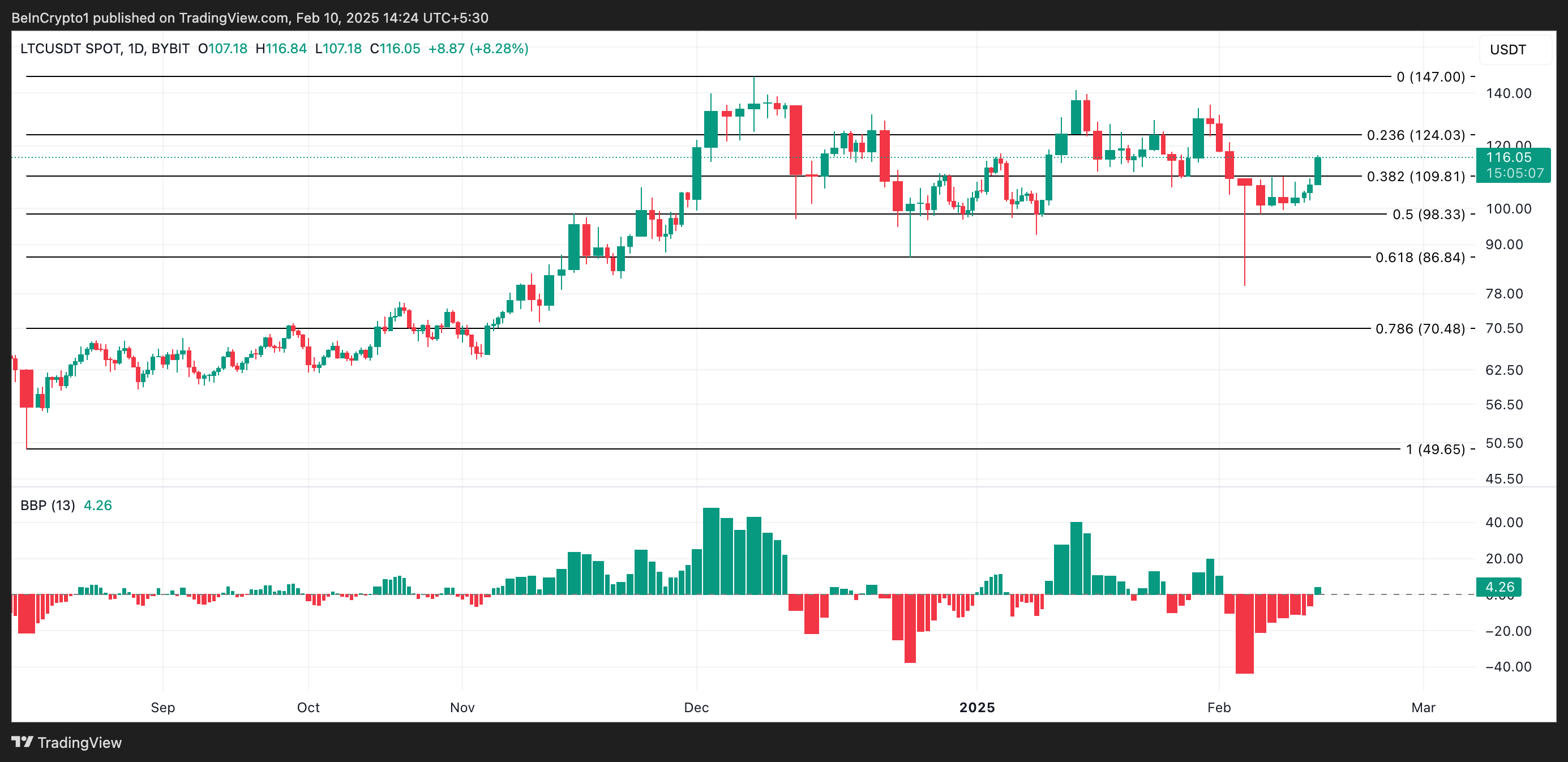 LTCs Elder-Ray Index har vist en positiv verdi for første gang på åtte dager, noe som fremhever den bullish endringen i markedstrendene. I skrivende stund er den på 4,26.
