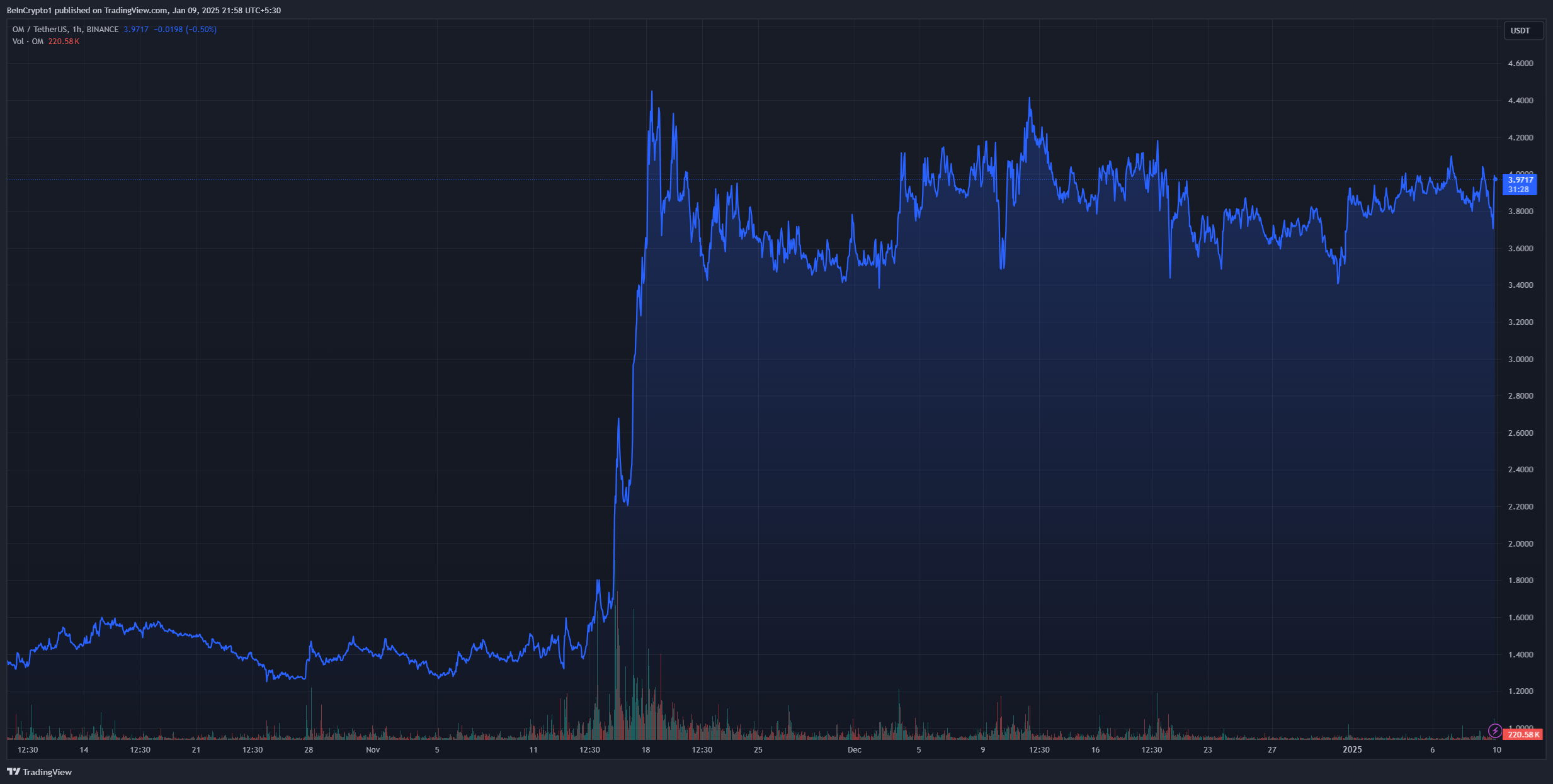 MANTRA lanserte sitt mainnet i oktober. Siden da har dens native token, OM, sett en betydelig økning i markedsverdi. Tokenet steg med 200 % de siste tre månedene til $ 3,6 milliarder, og nådde en all-time high i desember.