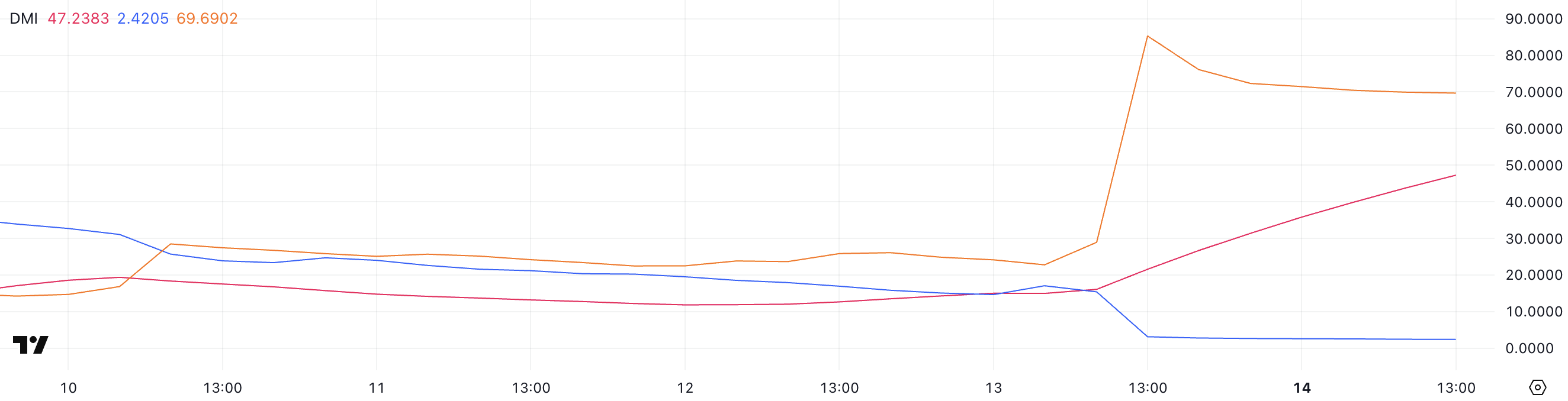 I mellomtiden har +DI, som måler kjøpspress, falt fra 3,12 til bare 2,42, noe som fremhever en fullstendig mangel på bullish respons på kollapsen.
