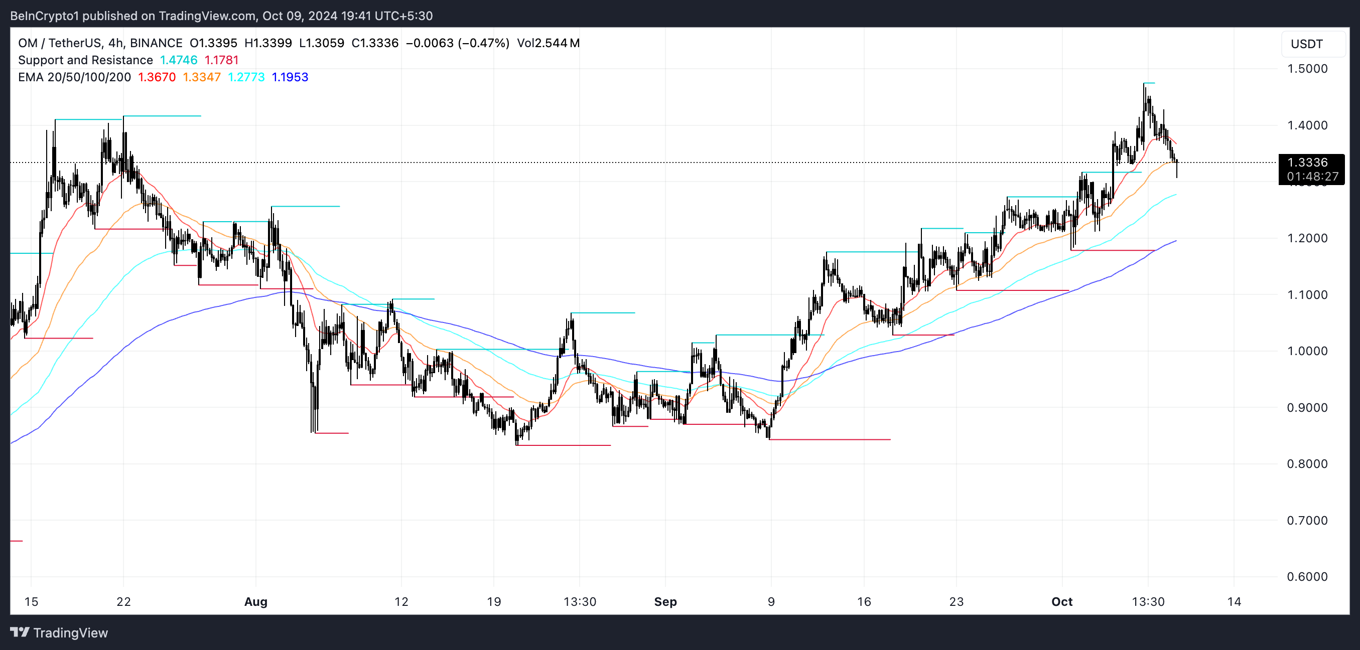 OMs EMA-linjer viser for øyeblikket en bullish struktur, med de kortsiktige EMAs plassert over de langsiktige, et typisk tegn på oppadgående momentum. Imidlertid begynner de kortsiktige EMAs å peke nedover, noe som indikerer at styrken bak den oppadgående trenden er i ferd med å avta.