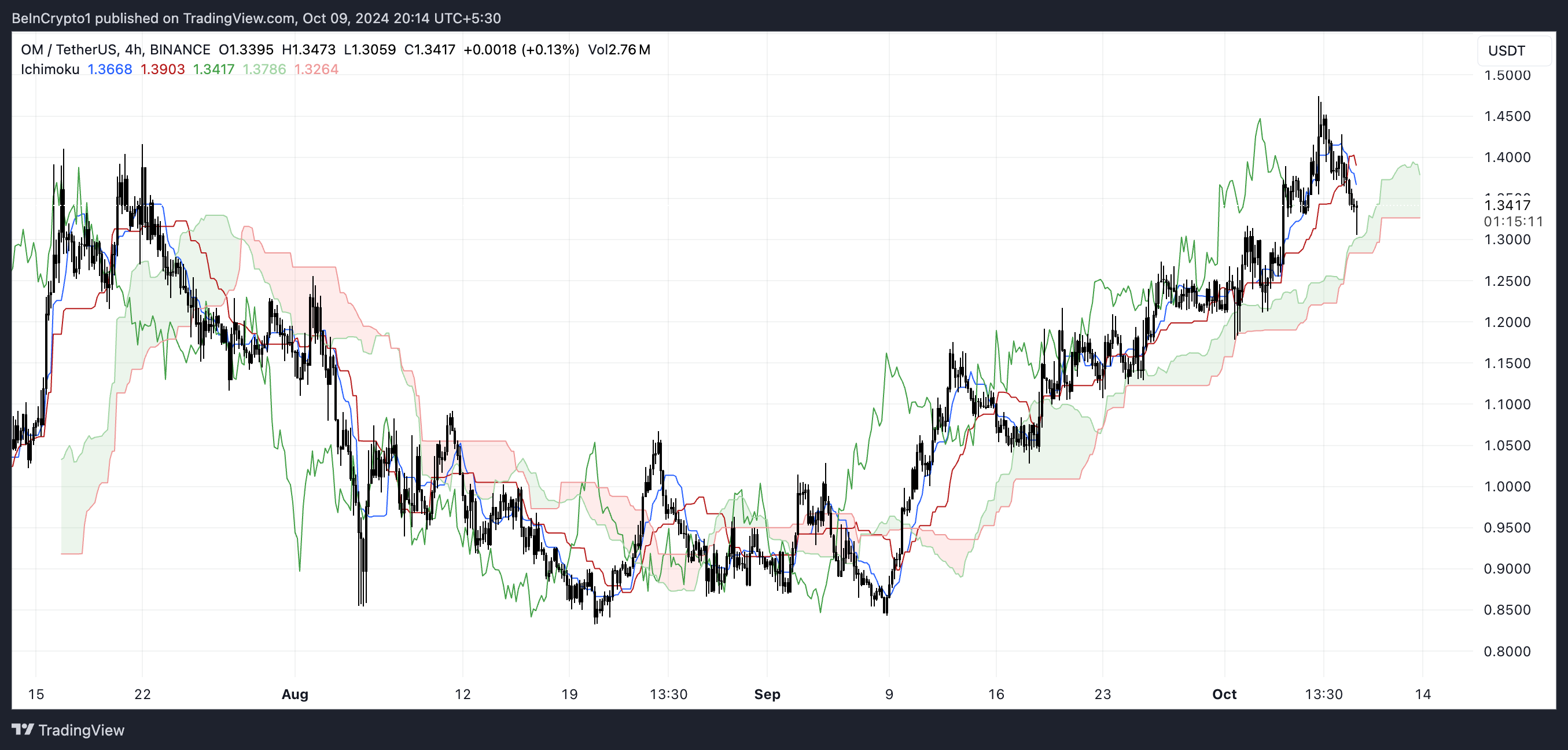 Ichimoku Sky-diagrammet for OM avslører en pris som for øyeblikket ligger over skyen, noe som indikerer at den er i en bullish fase. Imidlertid antyder nylige prisbevegelser et tap av momentum, ettersom OM har trukket seg tilbake fra sin nylige høyde, nær $ 1,45, til det nåværende nivået på rundt $ 1,34.