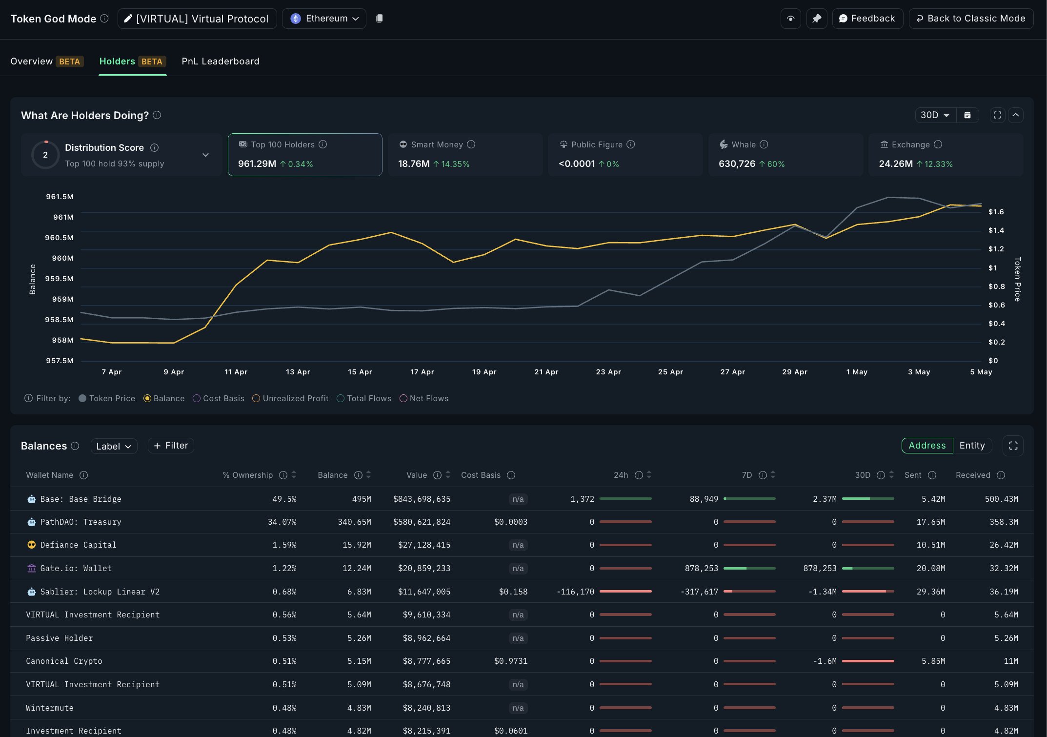 Likevel, bak den meteoriske prisutviklingen ligger en bekymringsfull konsentrasjon av makt. Ifølge blokkjedeanalysefirmaet Nansen, holder de 100 største lommebøkene nå 93 % av VIRTUALs totale forsyning.