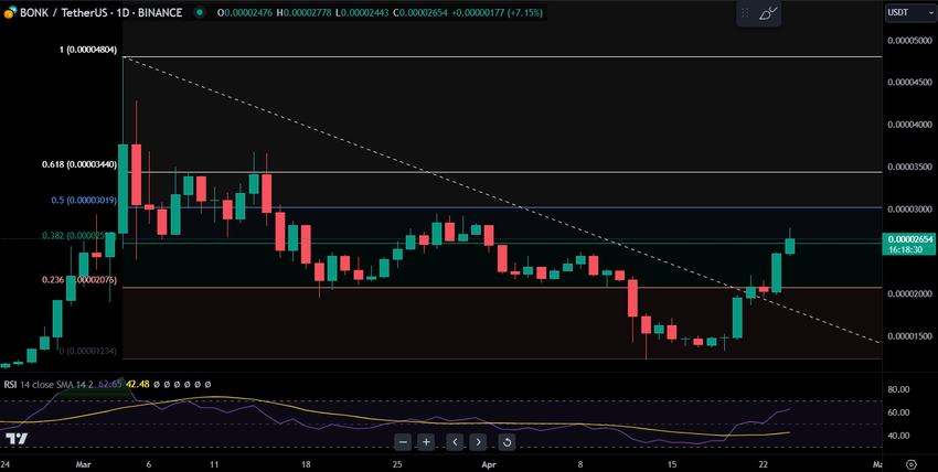 BONK-tokenet fanger blikket til kryptovalutaentusiaster ettersom prisen ser en bemerkelsesverdig stigning på hitlistene. 4-timers diagrammet avslører at BONK har seiret forbi motstanden på .382 Fibonacci-linjen, og oppnådde en økning på 7,35 % til et prispunkt på $ 0,00002659 i dagens handel. Grafen indikerer en sterk oppadgående trend, med en Fibonacci retracement som tyder på en betydelig oppgang fra de lavere nivåene.