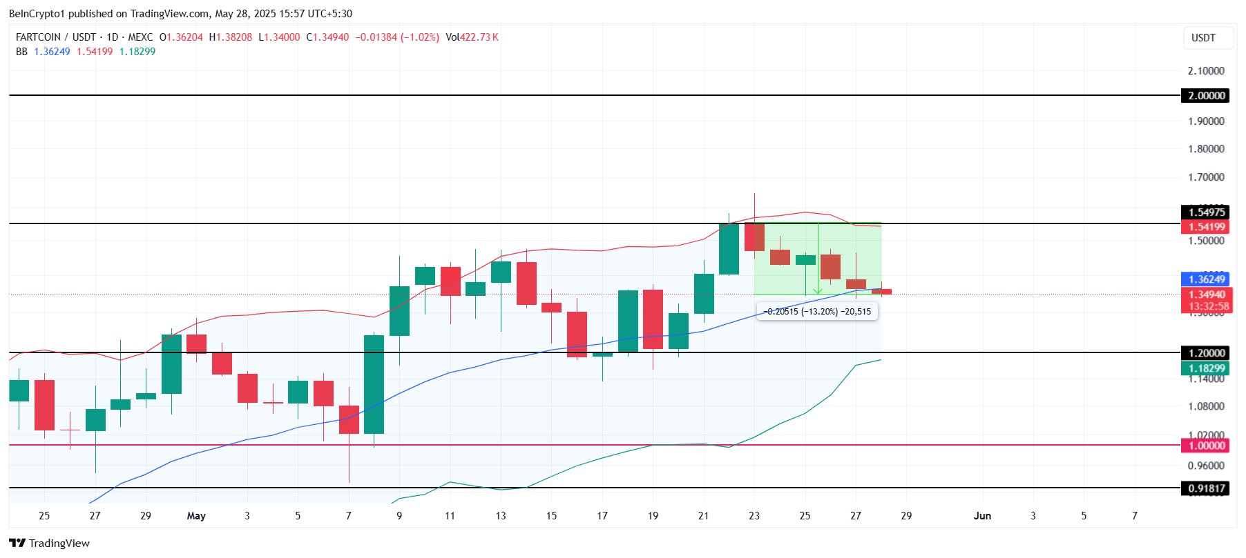 Bollinger Bands indikerer at FARTCOIN nærmer seg en klemme, noe som signaliserer kommende volatilitet. Lysestaken under basislinjen antyder at denne volatiliteten kan drive en prisøkning, potensielt presse FARTCOIN tilbake mot eller over $ 1,54 motstandsnivået.