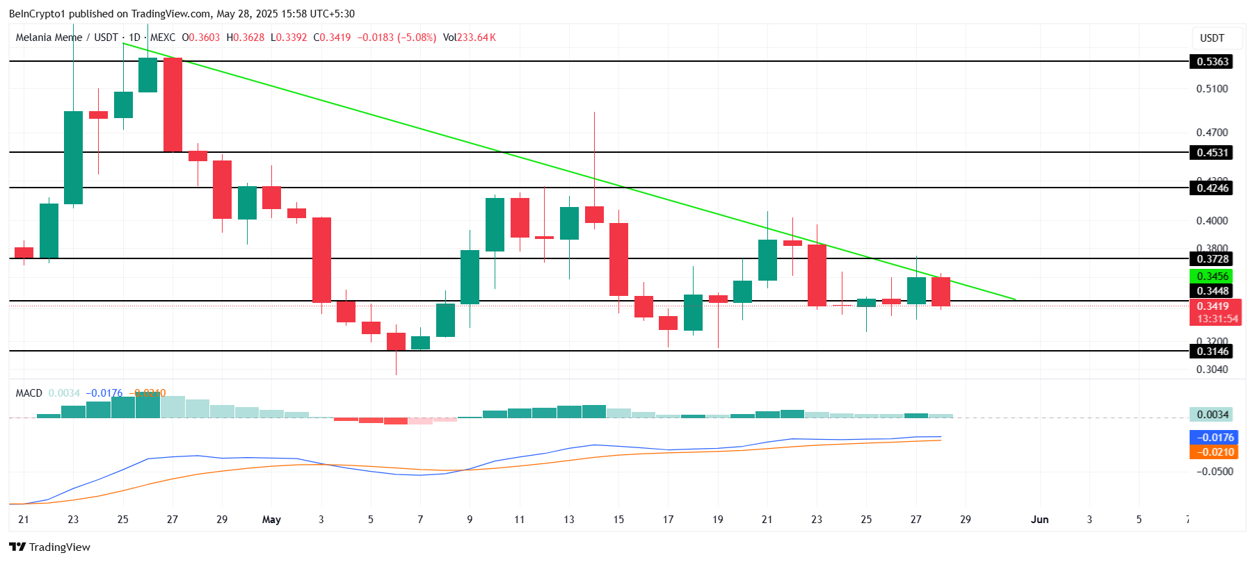MELANIA har vært i en nedadgående trend den siste måneden, og handles for øyeblikket til $ 0,341. Denne nedgangen har begrenset meme coinens evne til å oppnå oppadgående momentum og tiltrekke seg nye kjøpere midt i bredere markedsutfordringer.