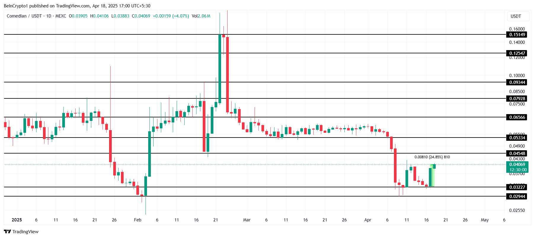 Inspirert av den beryktede bananen teipet til en vegg, oppnådde BAN betydelig berømmelse etter å ha blitt kjøpt av Trons grunnlegger, Justin Sun, for $ 6,2 millioner i fjor. Hvis tokenet fortsetter sin oppadgående momentum, kan det bryte $ 0,045-barrieren og potensielt snu den til støtte, og sikre sine gevinster.