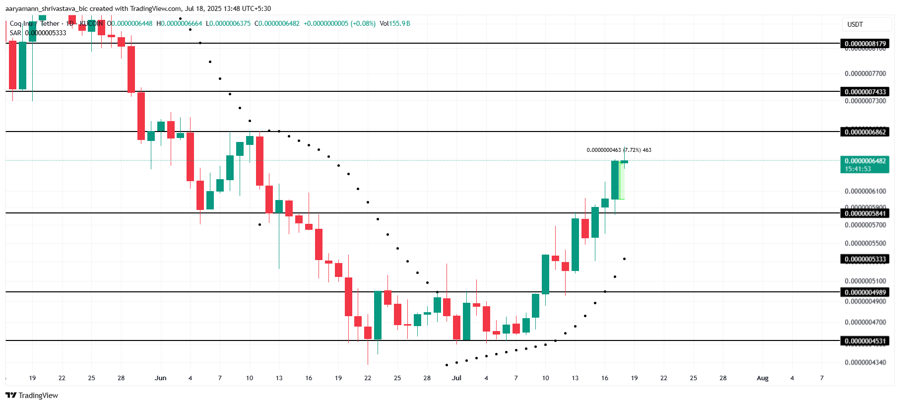 For at COQ skal fortsette sin oppadgående bane, må den bryte motstandsnivået på $ 0,0000006862. For øyeblikket handles den til $ 0,0000006482, og altcoinen viser tegn på en opptrend, støttet av den paraboliske SAR-indikatoren, som er plassert under lysestakene, noe som antyder at den bullish momentumet kan fortsette i nær fremtid.