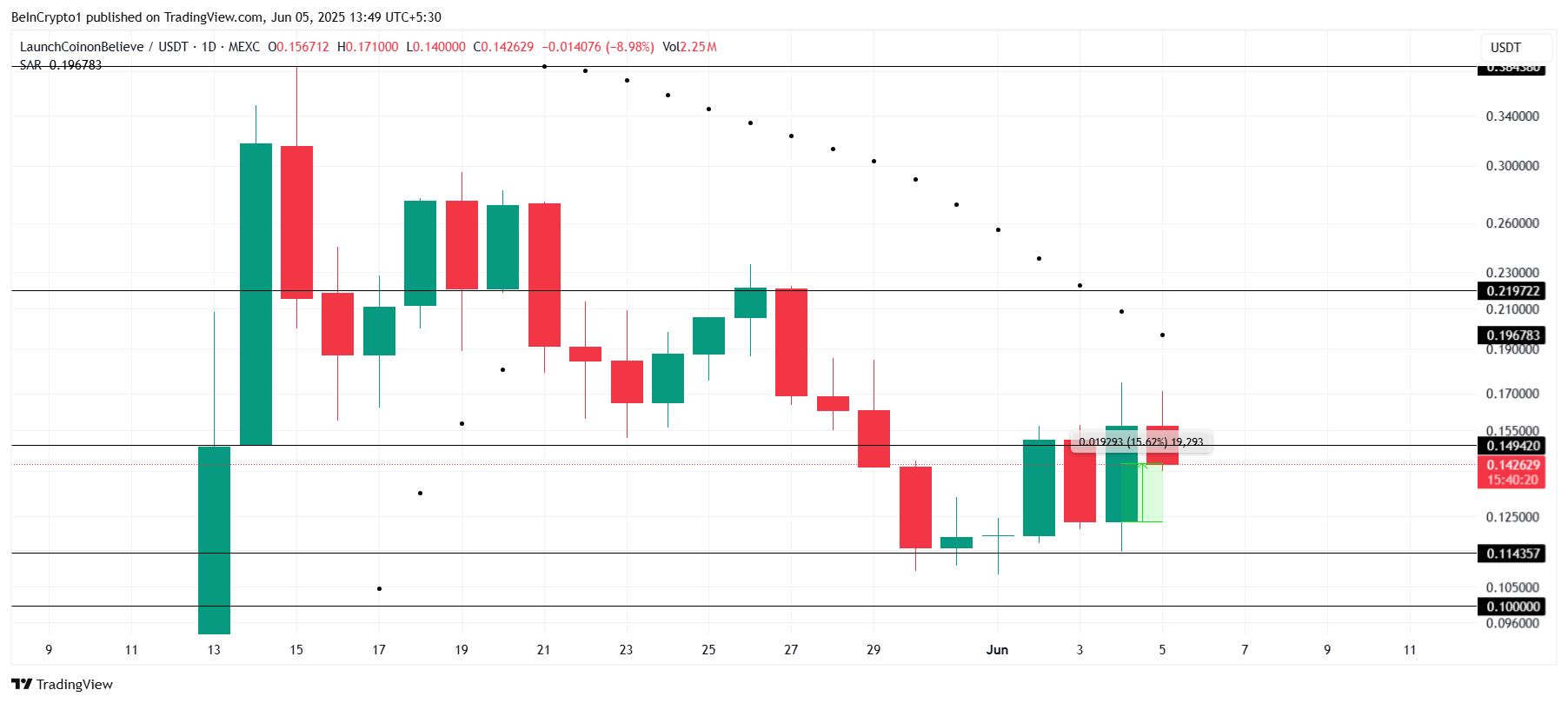 Til tross for dette fortsetter investorinteressen å vokse, og LAUNCHCOIN kan potensielt bryte $ 0,149, som vil fungere som et viktig støttenivå for videre prisbevegelser mot $ 0,219.