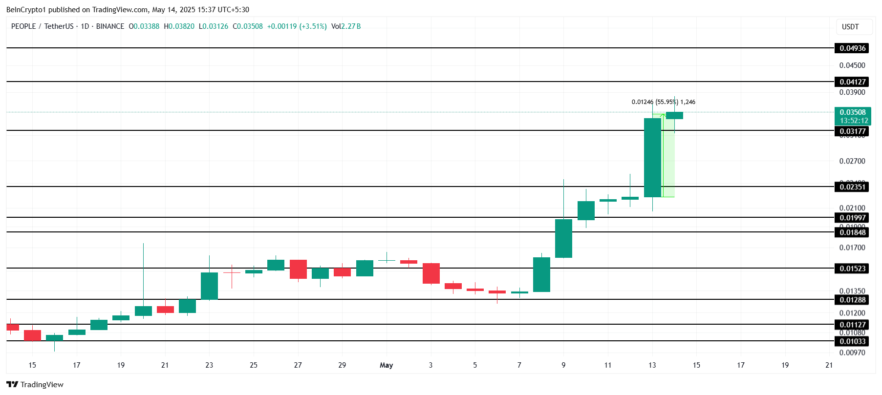 PEOPLE kurs steg 56 % i dag, noe som gjør det til en av de best presterende tokenene. Handlet til $ 0,035, jobber PEOPLE med å sikre $ 0,031 som et kritisk støttenivå. Denne oppgangen fremhever økt investorinteresse og kan signalisere mer positiv bevegelse hvis støttenivået holder seg sterkt i de kommende dagene.