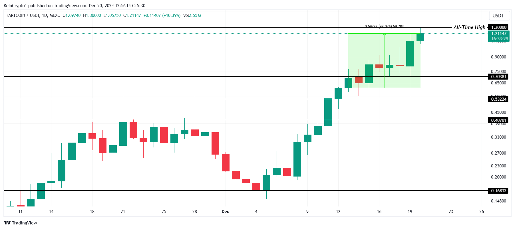 Fartcoin sjokkerte kryptomarkedet med en økning på 98 % denne uken, og nådde en ny rekordhøyde på $ 1,30 og en verdsettelse på $ 1,3 milliarder. Denne prestasjonen fremhever uforutsigbarheten til meme coins, ettersom tokenets humor-drevne appell fortsetter å tiltrekke seg betydelig interesse fra spekulative investorer.