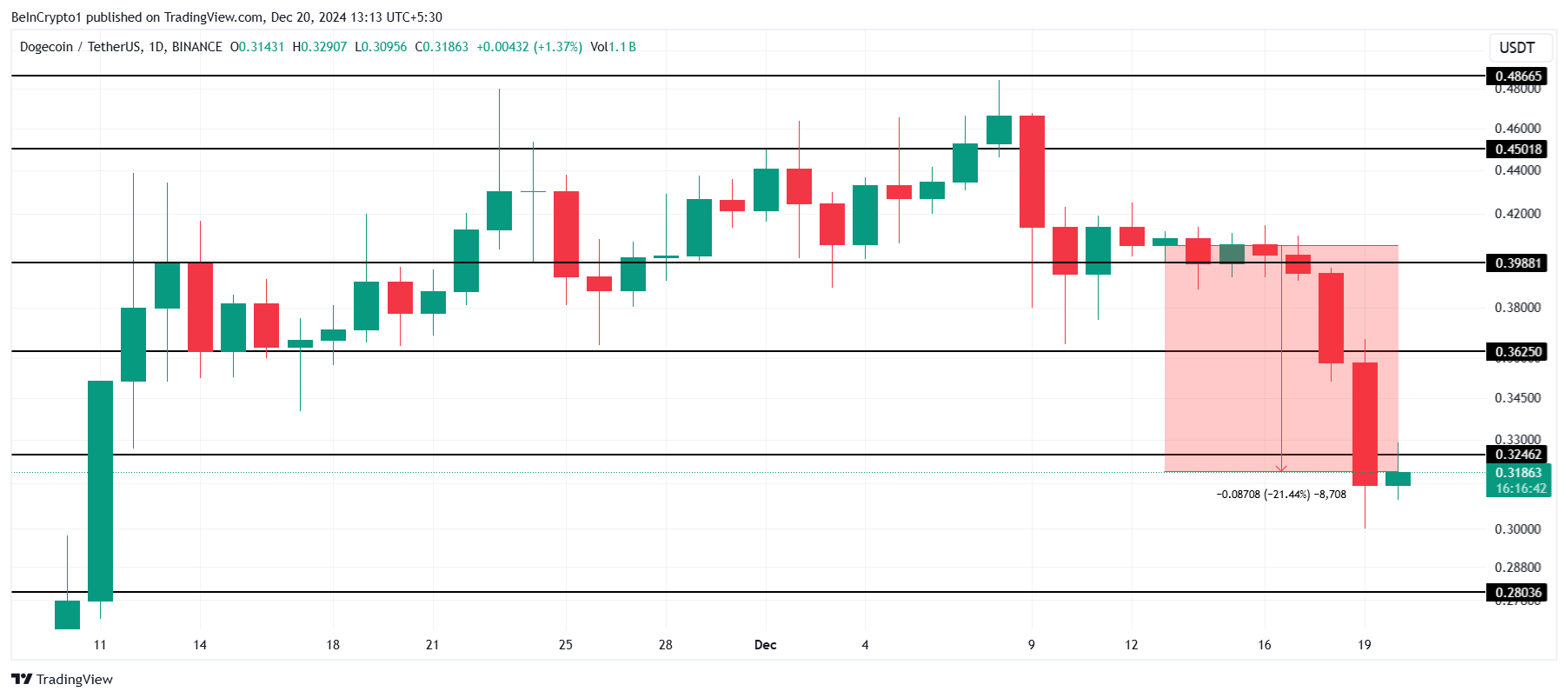Dogecoin kurs har falt med 21 % den siste uken på grunn av bearish markedstrender, og presset meme coinen til $ 0,31. Denne nedgangen reflekterer den bredere nedgangen i kryptovalutamarkedet, noe som påvirker investortilliten.