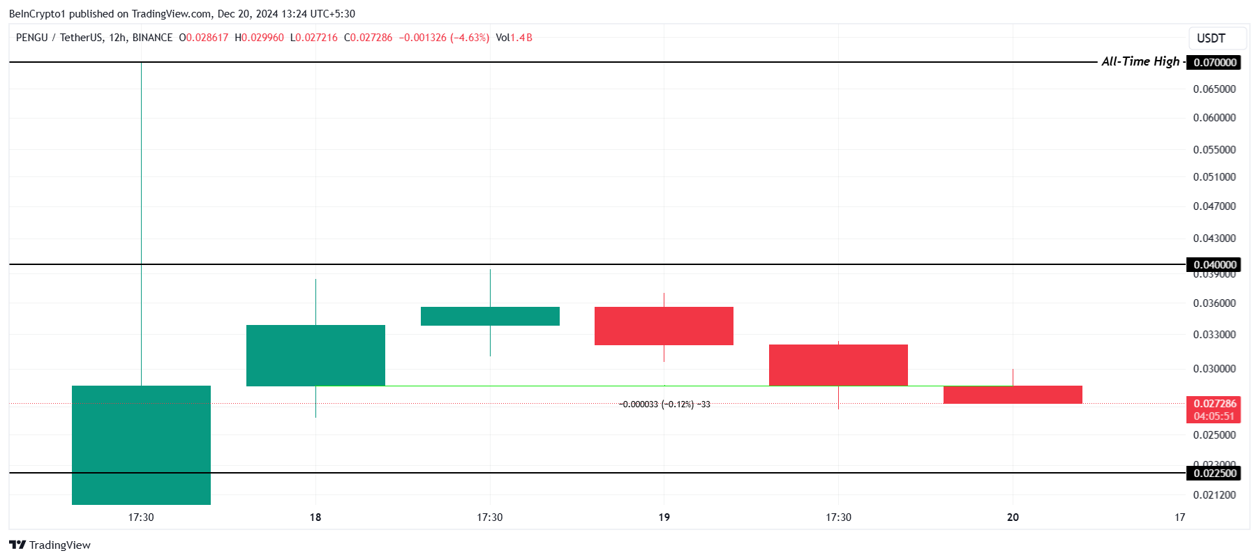 For øyeblikket har PENGU beveget seg kun 0,12 % de siste 48 timene, noe som reflekterer ubesluttsomhet i markedsretningen. Hvis etterspørselen opprettholdes, kan meme coinen stige til $ 0,040, noe som vil øke investortilliten. En slik økning vil markere en positiv vending for mynten, og tiltrekke mer oppmerksomhet til dens potensial.