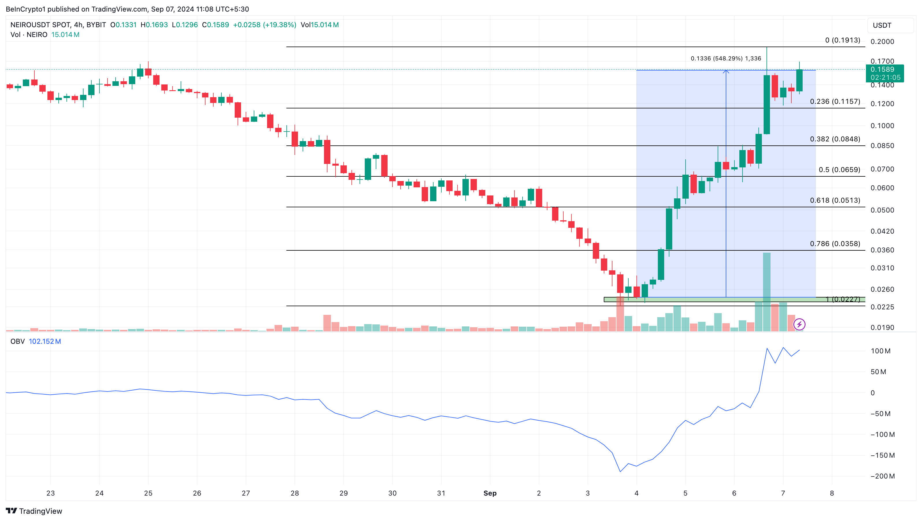 Til tross for rallyet, er NEIRO fortsatt 45 % under sin høyeste pris noensinne på $ 0,29. Imidlertid antyder On Balance Volume (OBV)-indikatoren sterk kjøpsinteresse, noe som signaliserer fortsatt markedstøtte for meme coinen.