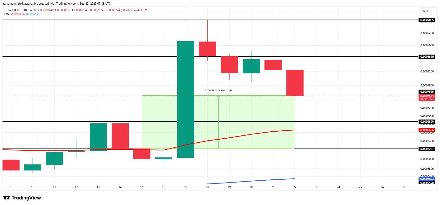 50-dagers EMA plassert under lysestakene viser at bullish momentum fortsatt er til stede. Hvis TOSHI klarer å holde seg, kan tokenet stige opp mot $ 0,00086. Å opprettholde denne stigningen vil gi rom for å presse høyere og forsøke $ 0,00098, noe som markerer en annen sterk bevegelse for meme coinen.
