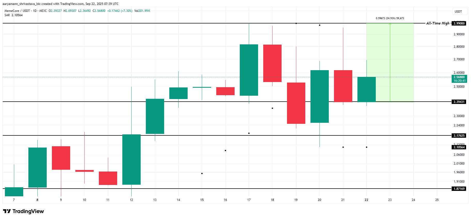 M kurs har holdt seg stabil sammenlignet med andre meme coins denne uken, og unngått store tap. Tokenet handles til $ 2,56, og holder seg over den viktige støtten på $ 2,39. Denne motstandskraften antyder at M-investorer forsvarer nivået, noe som kan forme den neste bevegelsen for coinen.