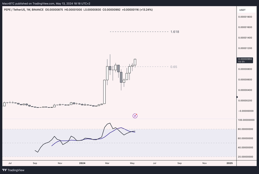 “PEPE ukentlig ser gal ut. Jeg har sett dette oppsettet mange ganger, vil sannsynligvis konsolidere seg her, bryte ut neste uke og pumpe til 1,618 ($ 0,00001555), ” sa MacnBTC.