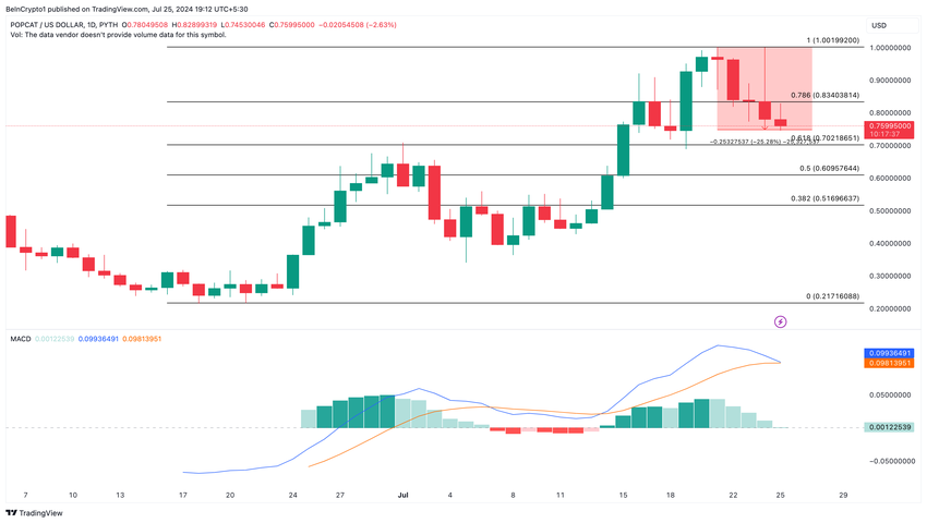 På det daglige diagrammet forblir Moving Average Convergence Divergence (MACD) positiv, noe som antyder at momentumet er optimistisk. Dette øker sjansen for en prisoppgang. Hvis dette vedvarer, kan POPCATs pris returnere til $ 0,84, muligens økende til $ 1.