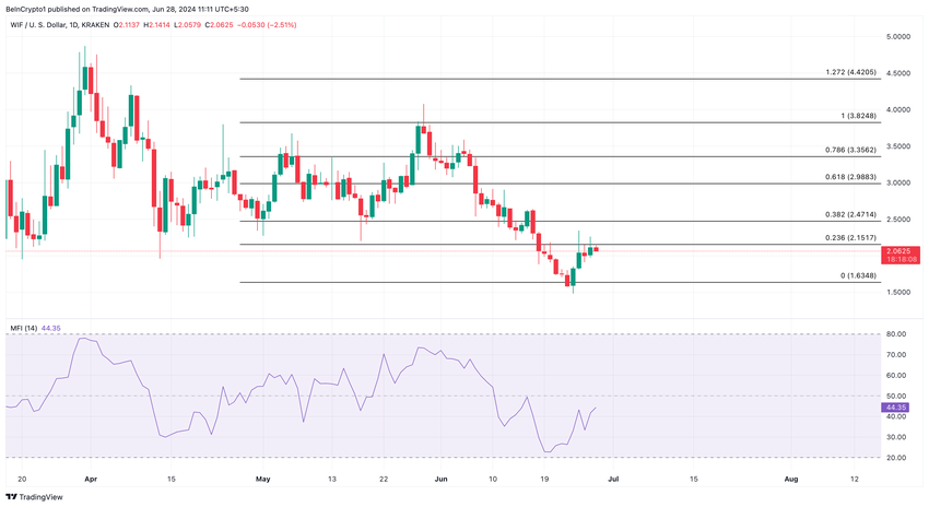 Kryptovalutaens verdi har imidlertid økt med 3,51 % de siste 24 timene. “Money Flow Index” (MFI) handles til $2,106 og viser at kapital har begynt å strømme tilbake til WIF-markedet.
