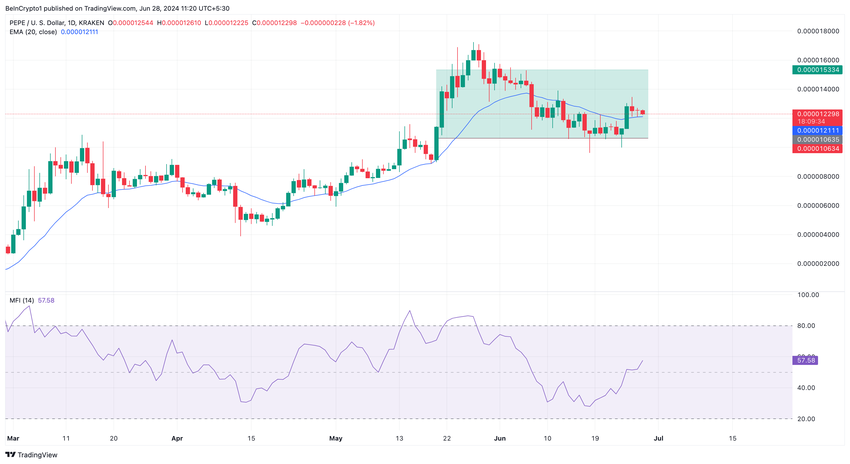 I skrivende stund handles PEPE til $0,000012. Prisen er imidlertid over 20 EMA (blå), som er gjennomsnittsprisen på kryptovalutaen de siste 20 handelsdagene. Så lenge PEPE ikke faller under denne prisen, vil tokenet ikke gjennomgå en korreksjon.