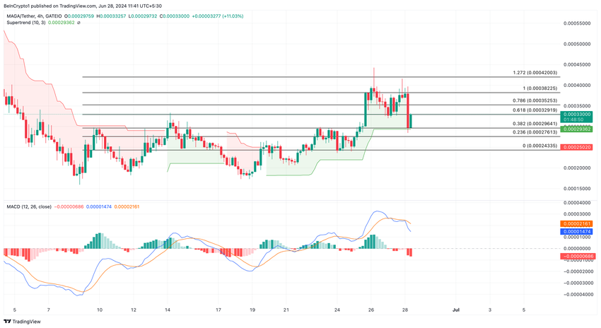 I skrivende stund er den grønne delen av Supertrend under MAGAs pris ‘spesielt på $0,00029. Dette innebærer et kjøpssignal for meme-mynten. Med den røde regionen ikke i nærheten, kan MAGA nå $0,00038 på kort sikt.