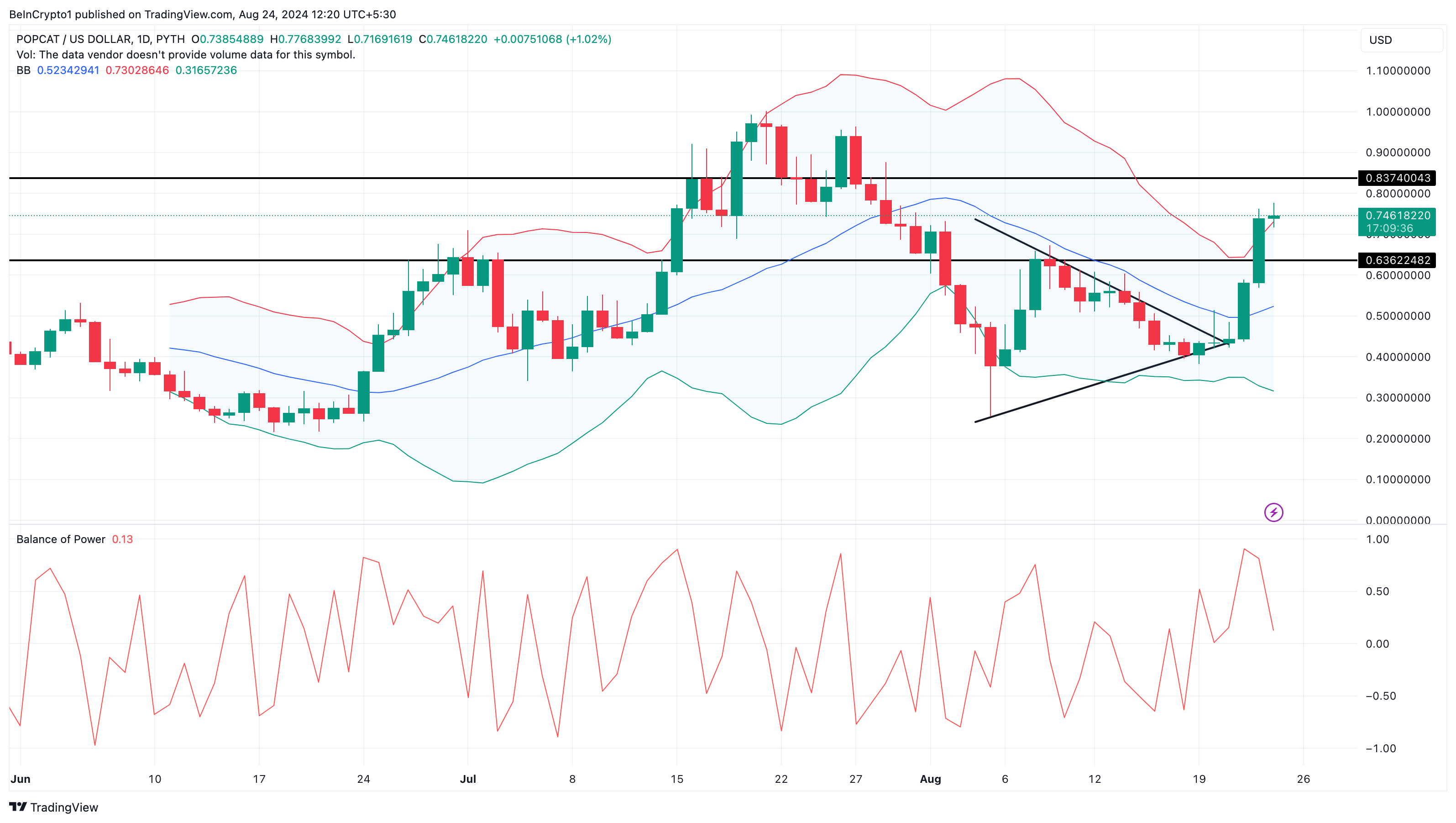 I de fleste tilfeller fører et brudd under det tekniske mønsteret til en lavere pris. Men for POPCAT, brøt den over mønsteret og hjalp prisen med å nå en månedlig høyde. Videre har Bollinger Bands (BB) utvidet seg, noe som indikerer ekstrem volatilitet rundt det Solana-baserte tokenet.