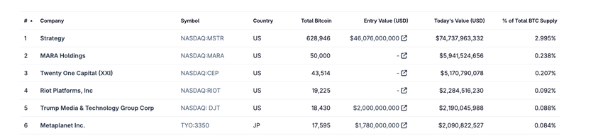 Etter det nåværende kjøpet opprettholder Metaplanet fortsatt sin posisjon som det sjette største børsnoterte Bitcoin-holdingselskapet. Det er en svært liten avstand mellom Trump Media & Technology Group Corp og Metaplanet for 5. posisjon.