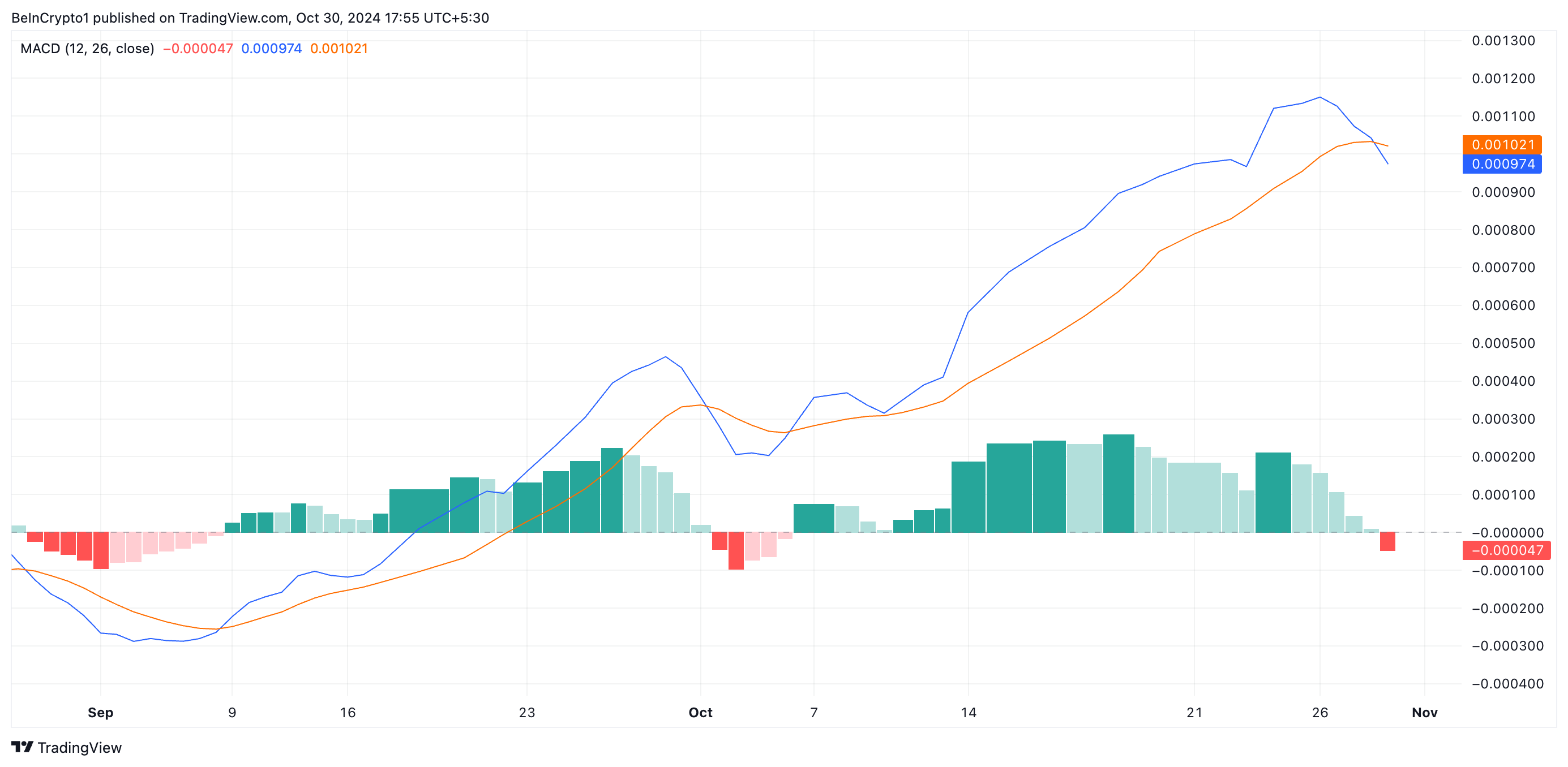 En analyse av MEW/USD ett-dags diagrammet avslører at MACD-linjen (blå) nylig krysset under signallinjen (oransje). Dette krysset antyder økende salgspress, noe som kan drive prisen lavere ettersom tradere begynner å forlate posisjoner eller ta gevinster.