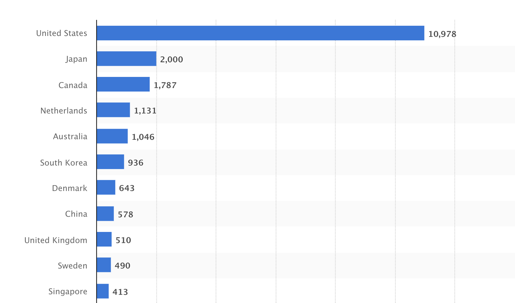 Eiendeler under forvaltning av offentlige pensjonsfond over hele verden. Kilde: Statista