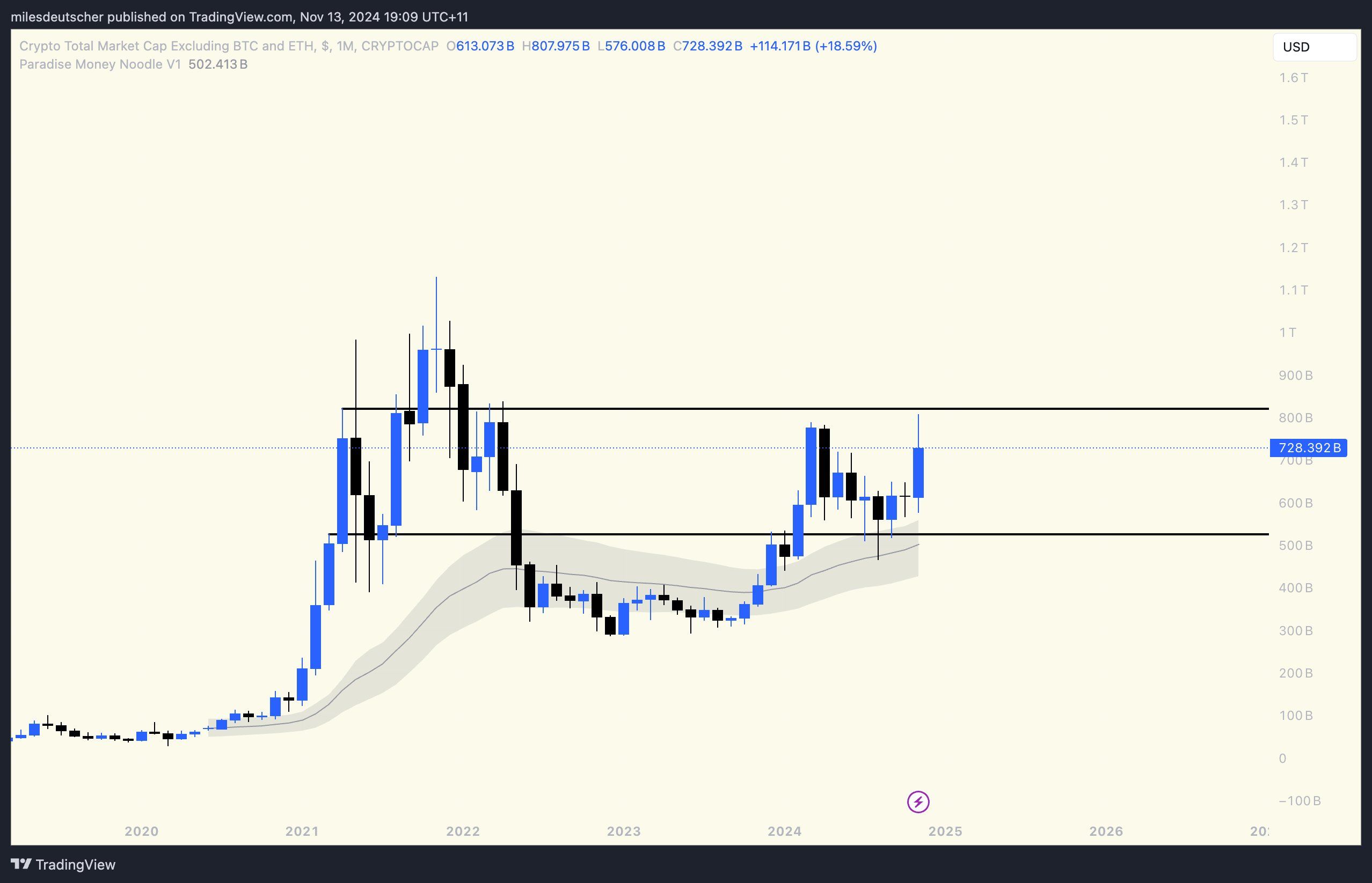 Deutschers innlegg på X (tidligere Twitter) viste TOTAL3s månedlige diagram, som indikerte at det hadde dannet et sterkt støttenivå. Innlegget avslørte også at den nylige prisstigningen på altcoins har løftet markedsverdien over betydelig motstand.