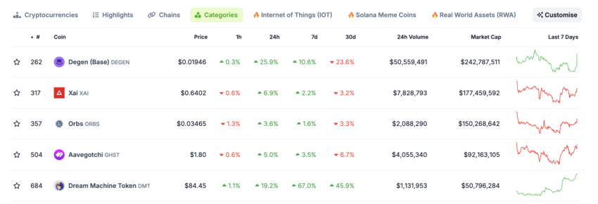 Layer 3-markedet har en markedsverdi på 713 millioner dollar og et 24-timers handelsvolum på 65,6 millioner dollar. Bemerkelsesverdige L3-prosjekter inkluderer Degen (Base), Xai, Orbs, Aavegotchi og Dream Machine Token.