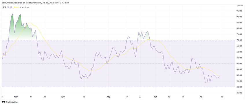 Når RSI-momentumet er svakt, indikerer det ofte at eiendelen kan slite med å vinne ytterligere terreng og kan møte motstand i å fortsette sin bullish trend. I tillegg til dette domineres markedet for tiden av salgspress. Selgere er overveldende kjøpere, noe som fører til nedadgående prisbevegelse.