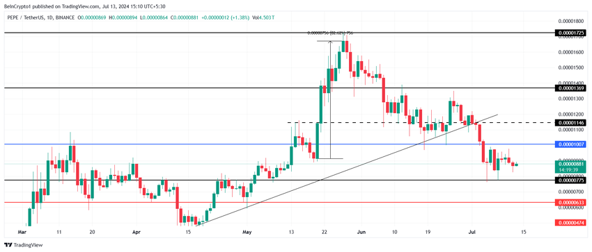PEPE-prisen handles til $0,00000881 svever under $0,00001000 og venter på en bullish utløser for å starte et rally. Dette vil være gunstig for investorene ettersom fortjenesten deres forblir fast i limbo på grunn av meme-myntens konsolidering.