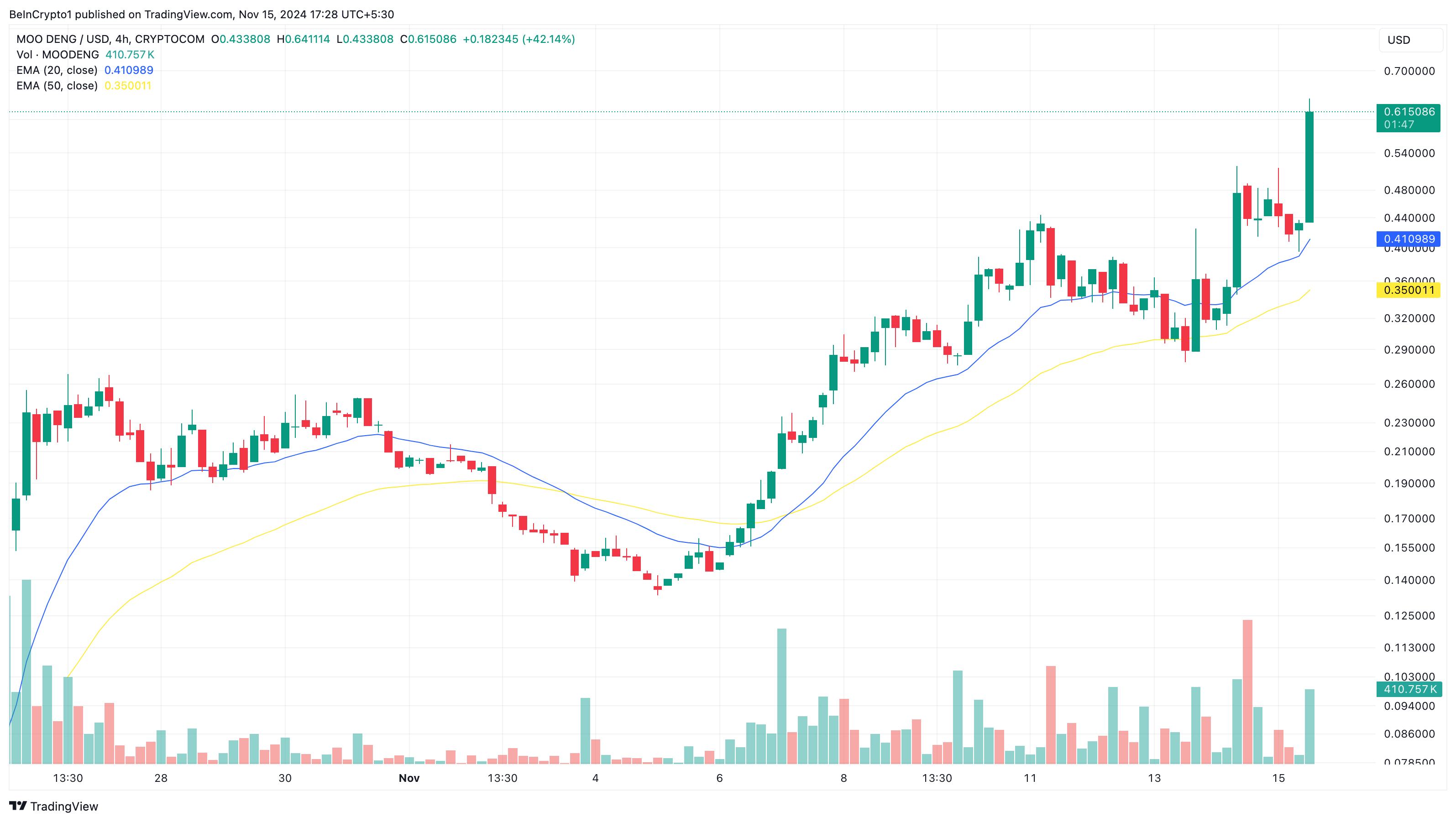 På torsdag, 14. november, var Moo Dengs markedsverdi mindre enn $ 300 millioner. Imidlertid, ettersom etterspørselen økte for det flodhest-tematiserte meme coin, klatret prisen fra $ 0,35 til $ 0,62.