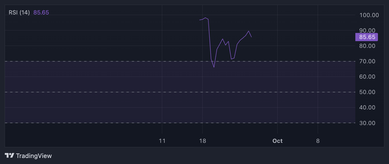 RSI er en indikator som måler en aktivas overkjøpte og oversolgte markedsforhold. Indikatoren varierer mellom 0 og 100, med verdier over 70 som indikerer at aktivaen er overkjøpt og sannsynligvis vil møte en korreksjon. På den annen side antyder verdier under 30 at aktivaen er oversolgt og kan være klar for en oppgang.