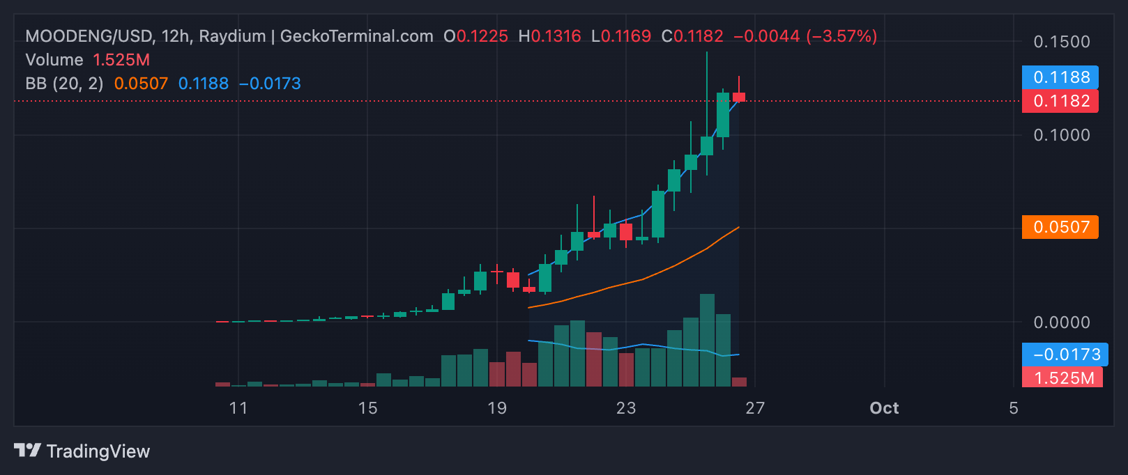 Altcoinen handles til $ 0.11 i skrivende stund, og noterer en prisoppgang på 41 % de siste 24 timene. I sammenligning har ledende meme-aktiva som Dogecoin (DOGE), Shiba Inu (SHIB) og Pepe (PEPE) sett sine priser stige med bare 4 %, 13 % og 8 %, henholdsvis, i løpet av samme periode.