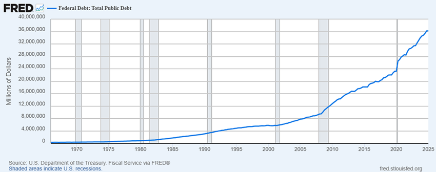 Dette diagrammet illustrerer den økende amerikanske føderale gjelden fra 1970 til 2025, og viser en jevn økning over årene.