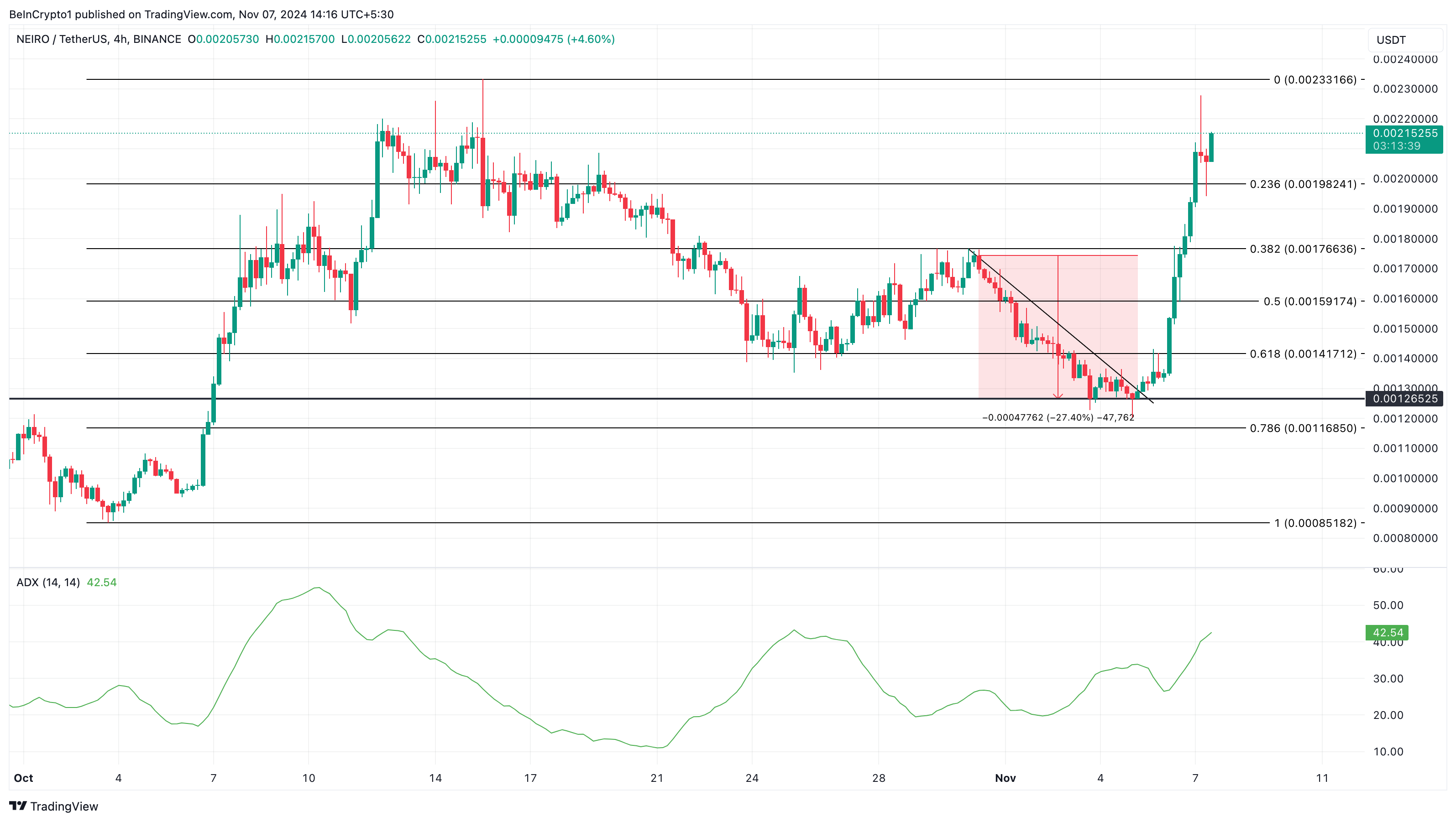 Mellom 30. oktober og tirsdag 5. november falt NEIROs pris fra $ 0,0017 til $ 0,0013. Imidlertid viser 4-timers diagrammet, som vist nedenfor, at salgspresset har avtatt ettersom meme coinen brøt ut av den nedadgående trendlinjen.