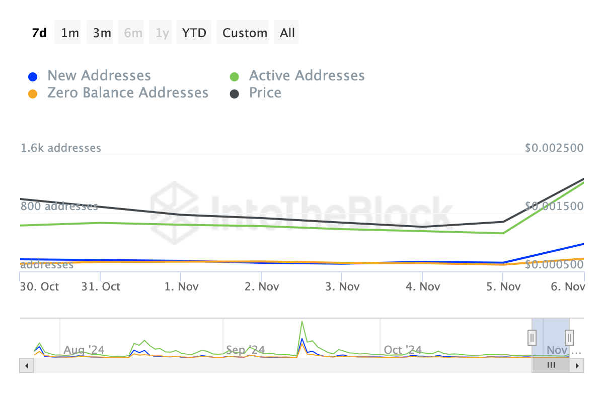 I tillegg fremhever nettverksaktiviteten en økning i investorfølelsen. Ifølge IntoTheBlock har aktive adresser økt med 130 % den siste uken, med nye og nullbalanse-adresser som også opplever betydelig vekst.