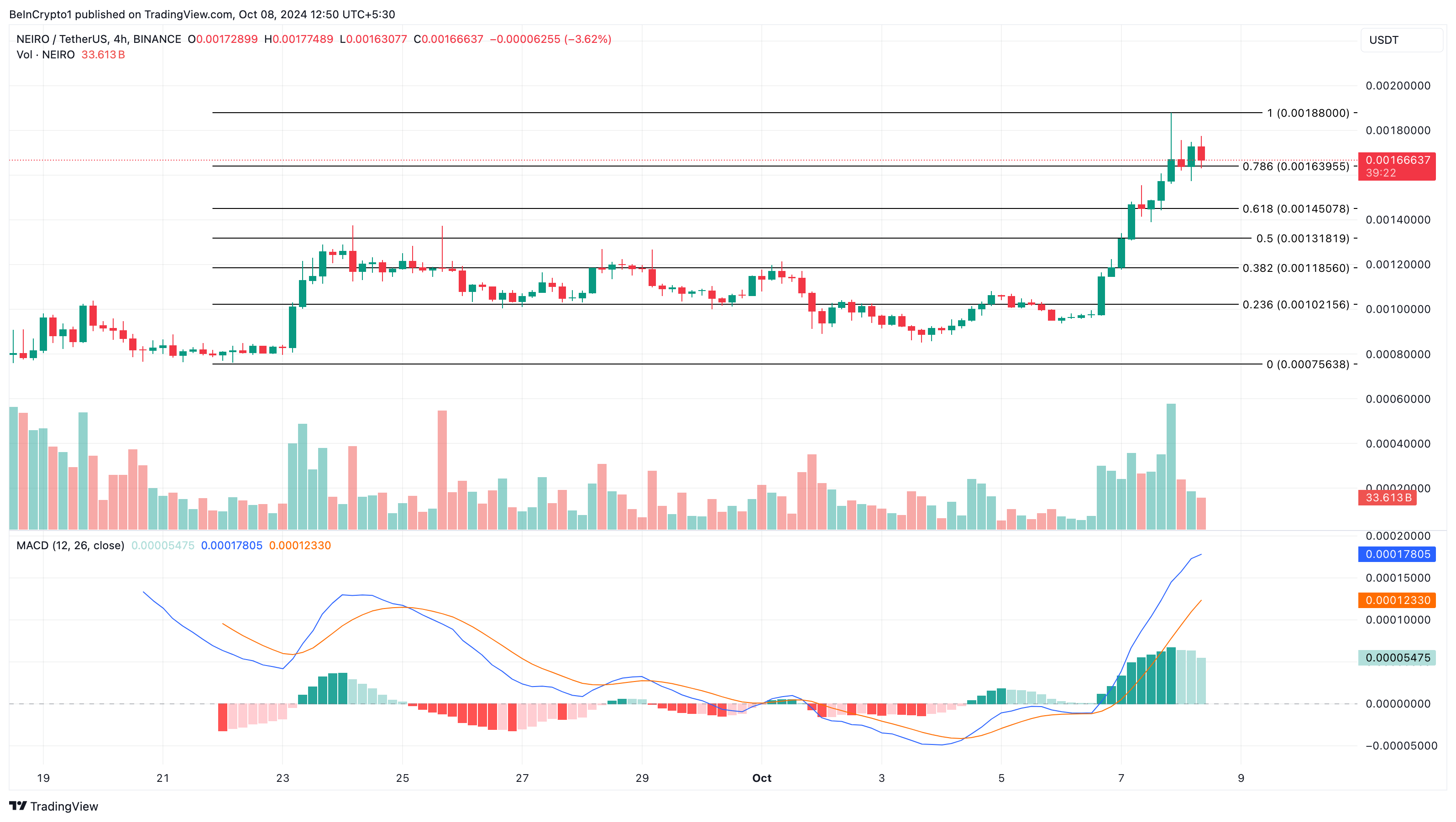 På 4-timers diagrammet ser NEIRO ut til å møte motstand på $ 0,0017. Imidlertid, med tanke på det nåværende momentumet, kan det bryte gjennom sonen. Når det skjer, kan NEIROs pris klatre forbi $ 0,0018 og rally utover $ 0,0020.