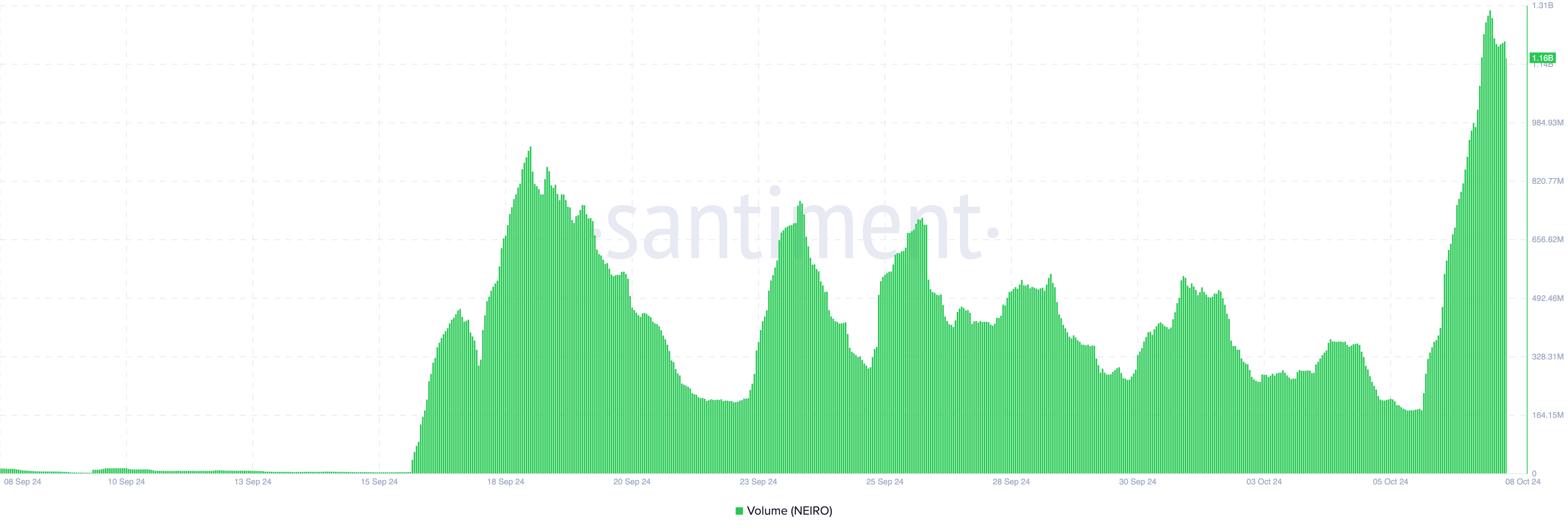 Som et resultat har NEIROs pris vært stigende mens den tidligere fortsetter å nå nye bunner. Samtidig viser en titt på meme coinens volum at det har oversteget $ 1 milliard for første gang siden lanseringen.