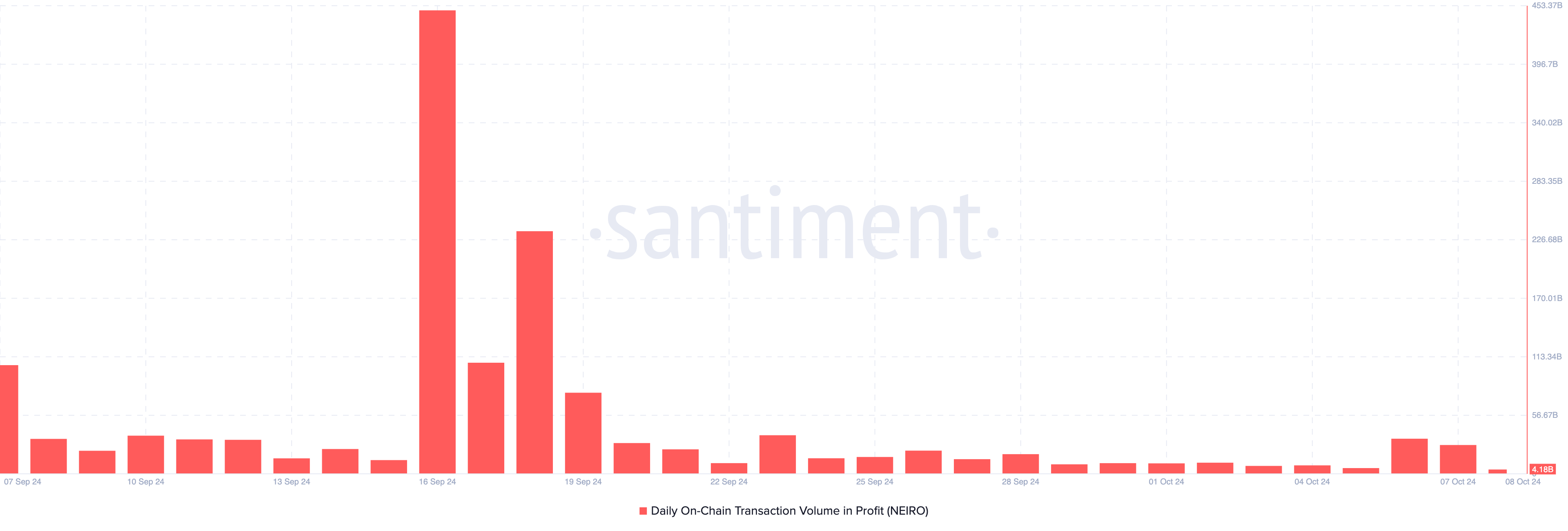 Til tross for prisoppgangen viser data fra Santiment at innehavere ennå ikke har realisert store fortjenester. Den 16. september var tokenets daglige on-chain transaksjonsvolum i fortjeneste 448,98 milliarder. I dag er tallet mindre enn 5 milliarder, noe som indikerer at NEIRO står overfor mindre salgspress og har større sjanse for å verdsettes.