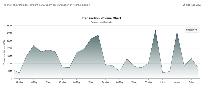 De daglige transaksjonene på Near-protokollen har vært preget av stor volatilitet, med betydelige fall i begynnelsen av april og slutten av mai.